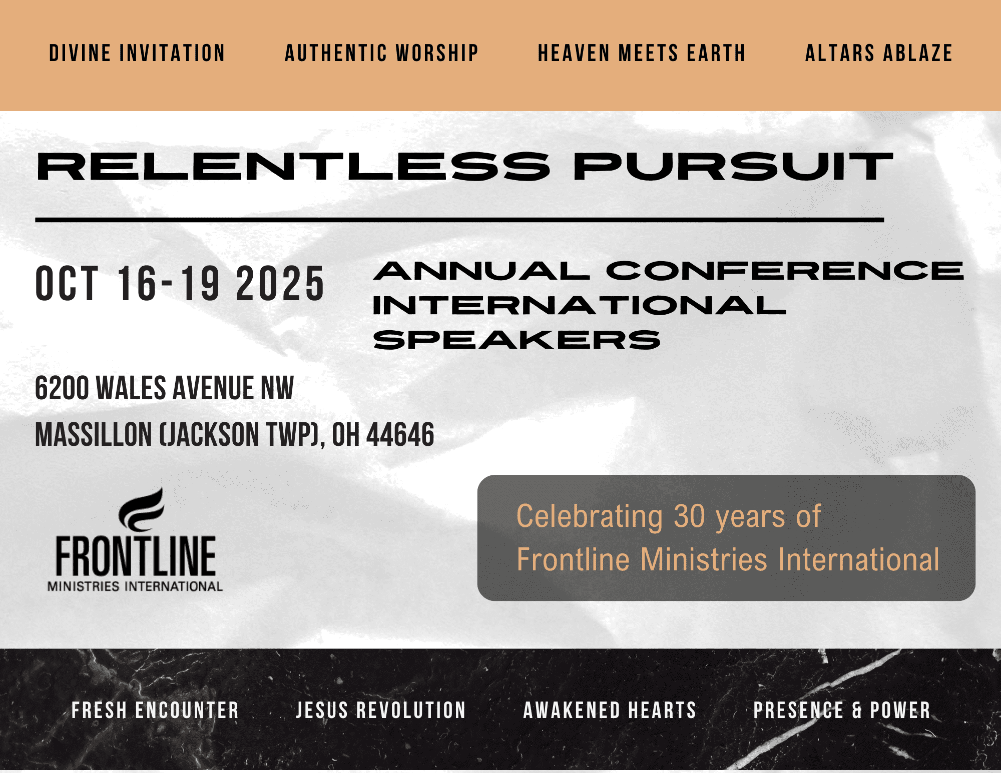 The Lord is raising up tribes of people all over the world to seek His face, hear from Heaven, and see His hand move across the globe in unprecedented ways. Our heart’s desire is to participate in His divine outpouring of glory, with His manifest presence being the center of our personal and corporate lives. We are interconnected with many in the Body of Christ, joining together to see the Kingdom of Heaven advanced regionally and abroad. With this goal in mind, Frontline Ministries International offers and hosts conferences, worship and prayer gatherings, equipping and encountering opportunities, outreaches and events in the community as well as overseas, and more.